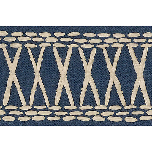 | /Created in collaboration with Mary McDonald, Tikki Tape in blue is a substantial trim with a graphic crisscross pattern embroidered in raffia. This...