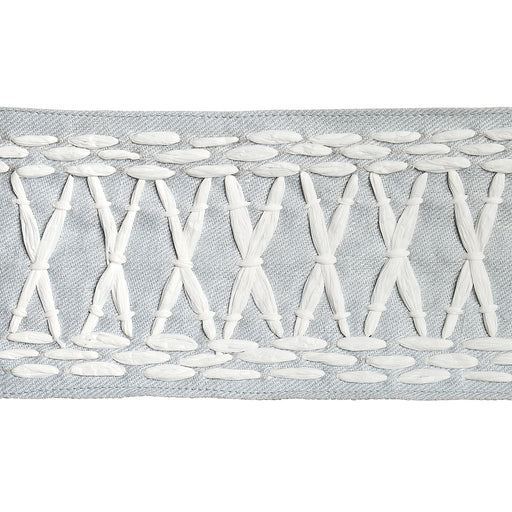 | /Created in collaboration with Mary McDonald, Tikki Tape in sky is a substantial trim with a graphic crisscross pattern embroidered in raffia. This ...