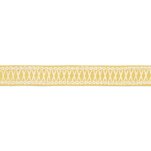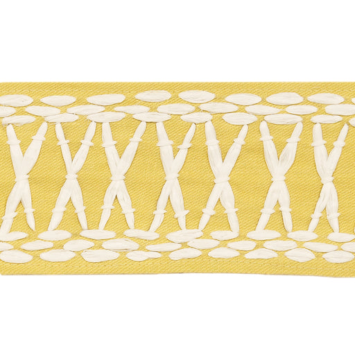 | /Created in collaboration with Mary McDonald, Tikki Tape in yellow is a substantial trim with a graphic crisscross pattern embroidered in raffia. Th...