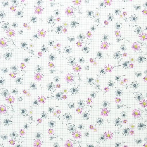 • Cosmos: Painterly daisy heads scattered across a gingham backdrop, printed on soft cotton percale for a delicate, airy effect.
