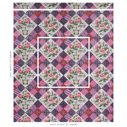 | /Caldwell Patchwork Chintz in fuschia-and-plum is a trompe l'oeil quilted pattern where lovely floral bouquets are framed by an intricate and charmi...