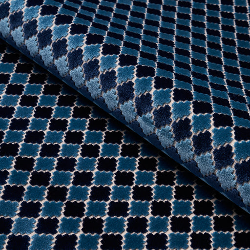 | /A lively small-scale geometric inspired by Moroccan tiles, indigo-colored Marrakesh Velvet is a dimensional two-tone velvet fabric with classic goo...