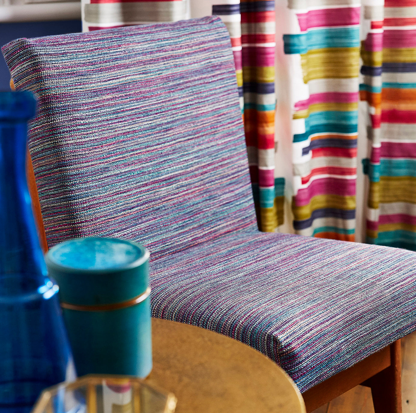All three Harlequin print fabric ranges include upholstery fabrics and sheers. Some of our favorites from the Momentum ranges include Pontia fabric in Emerald / Stone and Minouri in Teal / Mandarin / Lichen. Resembling a classic Missoni chevron, Minouri is a statement-making Harlequin print fabric.