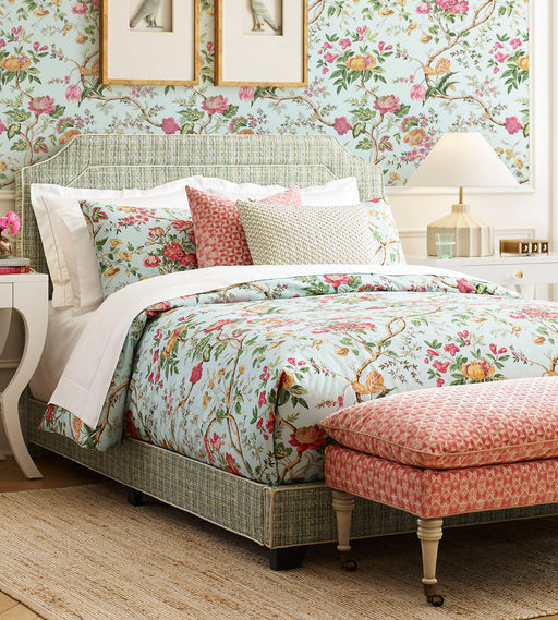 Scalamandre chinoiserie fabric paints scenes through intricate detailing of plants, florals, people, dragons and temples. Such beautiful Asian and chinoiserie fabric ranges from the colorful botanics of Shenyang Linen Print in Bloom.
