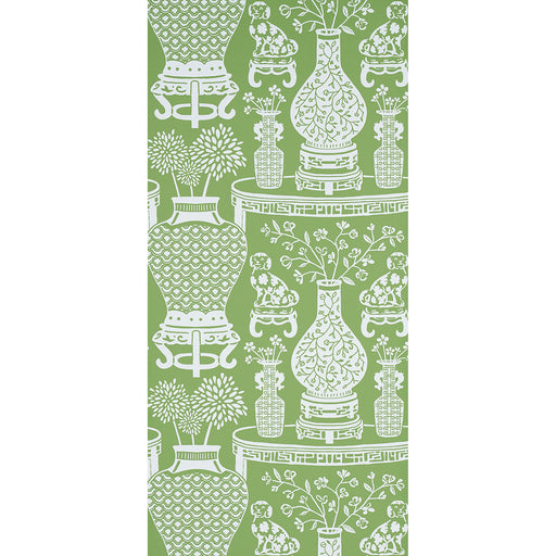 | /Hellene wallpaper in green features Ming vases and Staffordshire dogs in a pattern-on-pattern extravaganza with a mirrored repeat. Also available a...