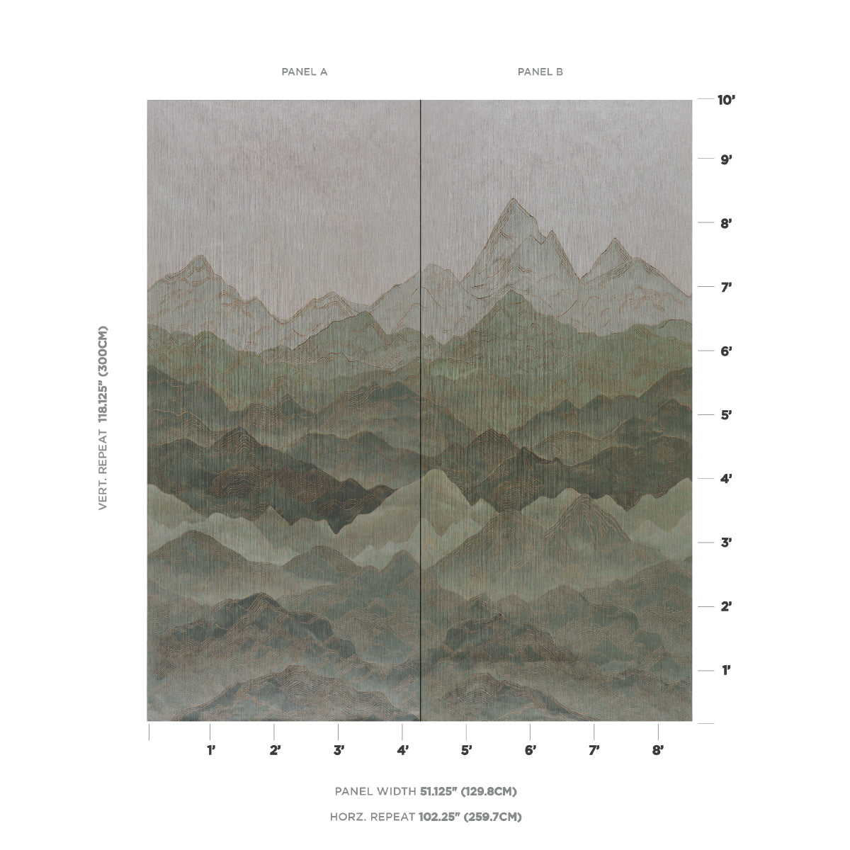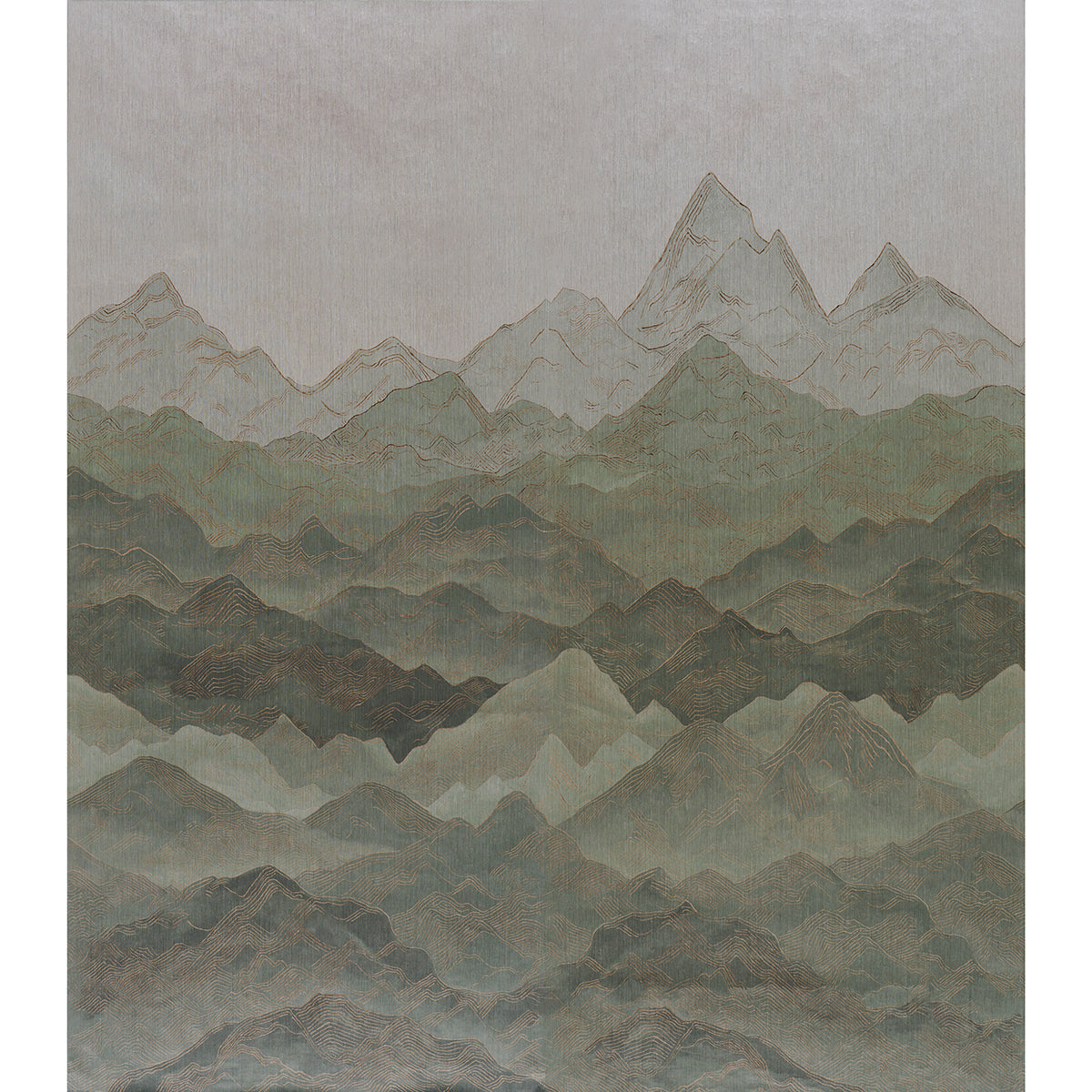 | /This large-scale two-panel scenic wallpaper creates a captivating and infinite mountainous landscape with a subtle gradient effect. Printed on stri...