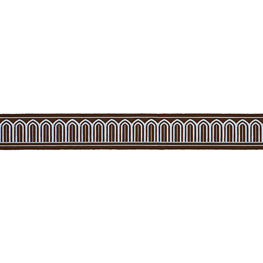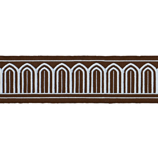 | /Designed by Miles Redd, Arches Embroidered Tape in sky on brown is a stylized scallop trim that boasts undeniable architectural influences. Also av...